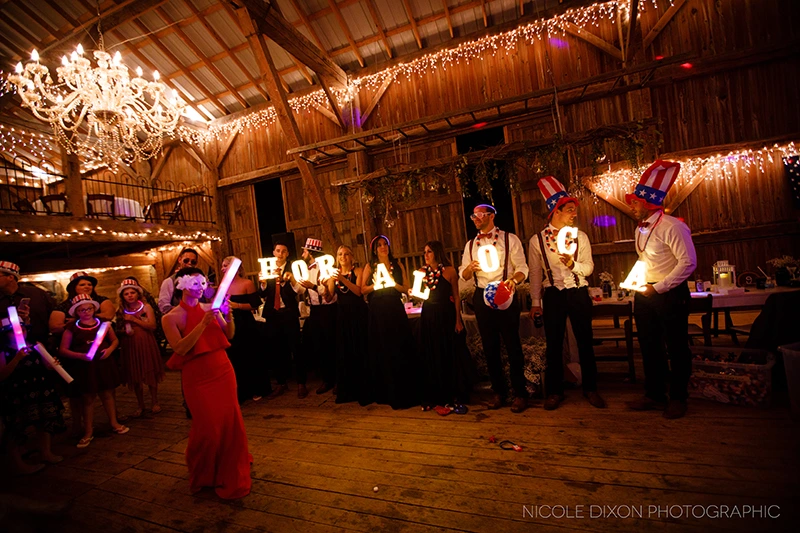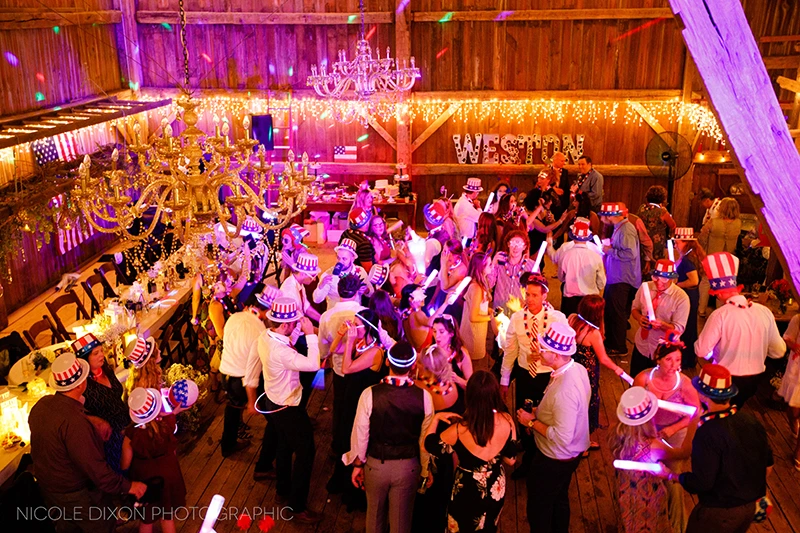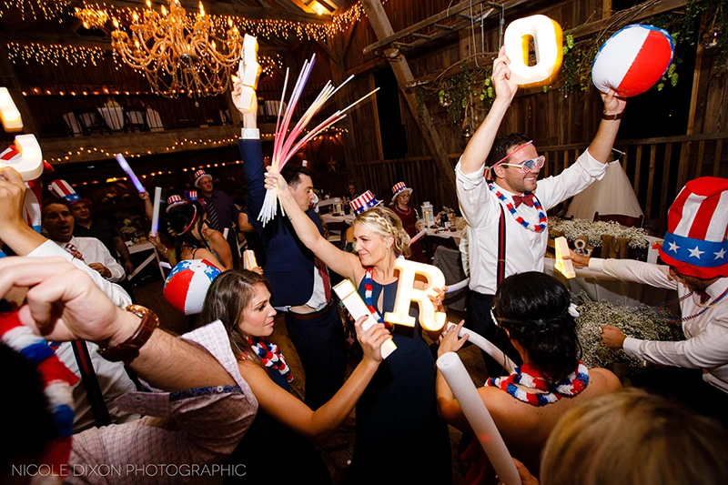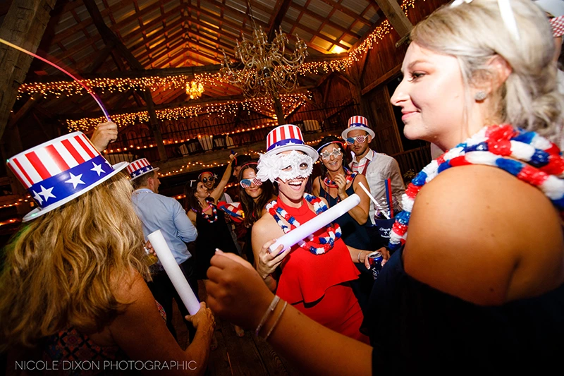 Congratulations to Stephanie and Max, who tied the knot Labor Day weekend! The patriotic theme (Stephanie LOVES the 4th of July!!), was on display from the red, white and navy color palette, to the sparkler send off! The Shepard Place Barn was the backdrop for this lovely day. Not even the rain could extinguish their fireworks! Stephanie surprised her father and groom with an outfit change for the dance floor. She changed out of her Cinderella skirt into a gorgeous form fitting gown. Night Music played the couple’s favorite songs all night long and into”La Hora Loca!” The Crazy Hour! The wedding party handed out patriotic hats, masks and jewelry and Stephanie changed into her third and final dress and everyone danced into the night.